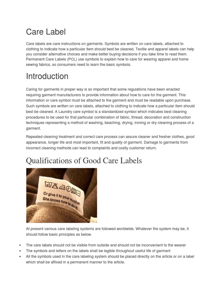 Care Labels used on Garments - Textile School The symbols and letters on the labels shall be legible throughout the useful life of the garment. All the symbols used in the care labelling system should be placed directly on the article or on a label which shall be affixed in a permanent manner to the article. Care labels should be made of a suitable material with resistance to the care ...